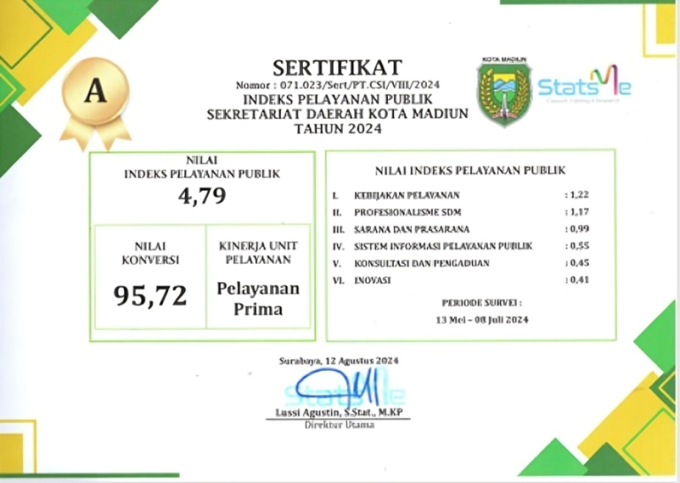 Nilai Indeks Pelayanan Publik (IPP) pada Bagian Umum Sekretariat Daerah Kota Madiun Tahun 2024 adalah 4,79 dengan nilai konversi 95,...
