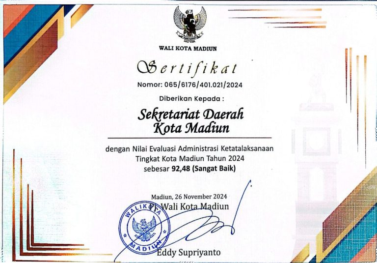 Pada Jumat, 29 November 2024, Pj. Wali Kota Madiun menyerahkan Sertifikat Nilai Evaluasi Administrasi Ketatalaksanaan Tingkat Kota Madiun pada 2024...