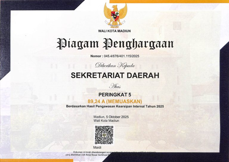 Berdasarkan hasil Pengawasan Kearsipan Internal Tahun 2025 oleh Dinas Perpustakaan dan Kearsipan Kota Madiun, Sekretariat Daerah mendapatkan Peringkat 5 dengan...