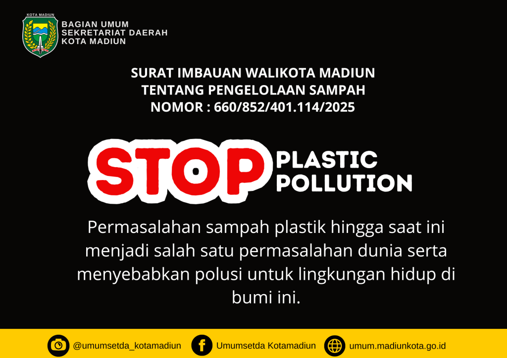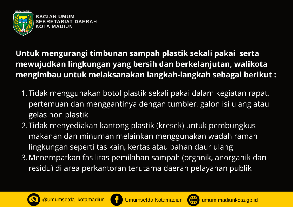 Langkah ini merupakan bagian dari upaya Pemerintah Kota Madiun dalam mewujudkan lingkungan yang bersih, sehat, dan berkelanjutan. Diharapkan seluruh perangkat daerah dapat segera menindaklanjuti imbauan ini dan menjadi teladan dalam pengelolaan sampah plastik di masyarakat. Karena bumi tak butuh janji, ia butuh aksi. Dan aksi itu… dimulai dari kita.