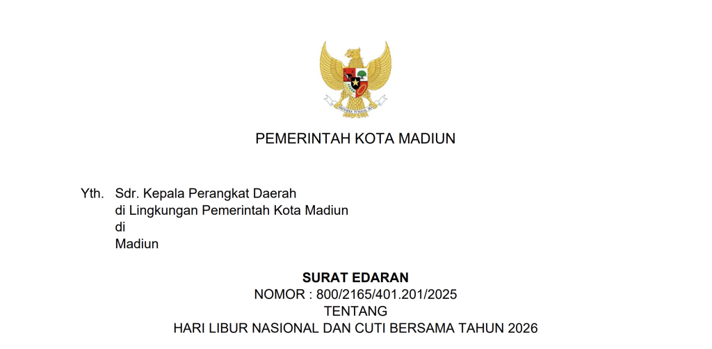 Berita Info Publik Surat Edaran Hari Libur Nasional dan Cuti Bersama Tahun 2026 2 months ago ppid Surat Edaran Libur dan Cuti 2026Download Post navigation Previous “Panca Prasetya Bergema: Puluhan Peserta Tunjukkan Dedikasi ASN di Pemkot Madiun”Next Peraturan Wali Kota Madiun Nomor 40 Tahun 2025 tentang Keprotokolan