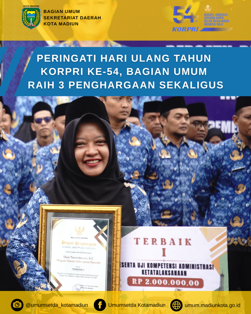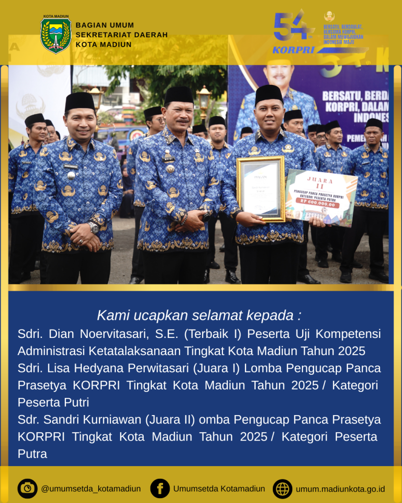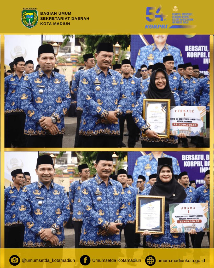 Pada hari Rabu (3/12), Pemerintah Kota Madiun menggelar Upacara Bendera Peringatan Hari Ulang Tahun (HUT) ke-54 KORPRI Tahun 2025 Tingkat Kota Madiun di Halaman Depan Balai Kota Madiun. Dalam kesempatan tersebut, Bapak Wali Kota Madiun menyerahkan sejumlah penghargaan kepada anggota KORPRI dan Perangkat Daerah yang berprestasi. Terdapat 7 (tujuh) kategori penghargaan, diantaranya Bagian Umum berhasil mendapatkan 3 (tiga) penghargaan untuk Uji Kompetensi Administrasi Ketatalaksanaan dan Lomba Pengucapan Panca Prasetya KORPRI Tahun 2025.