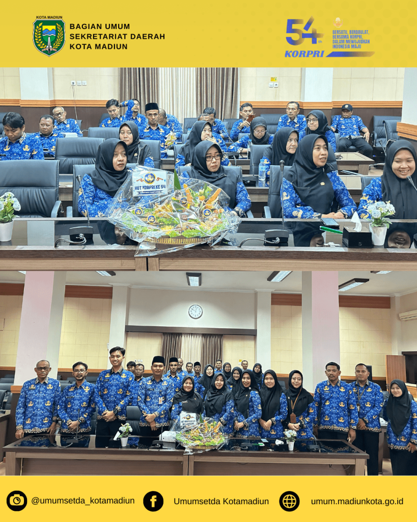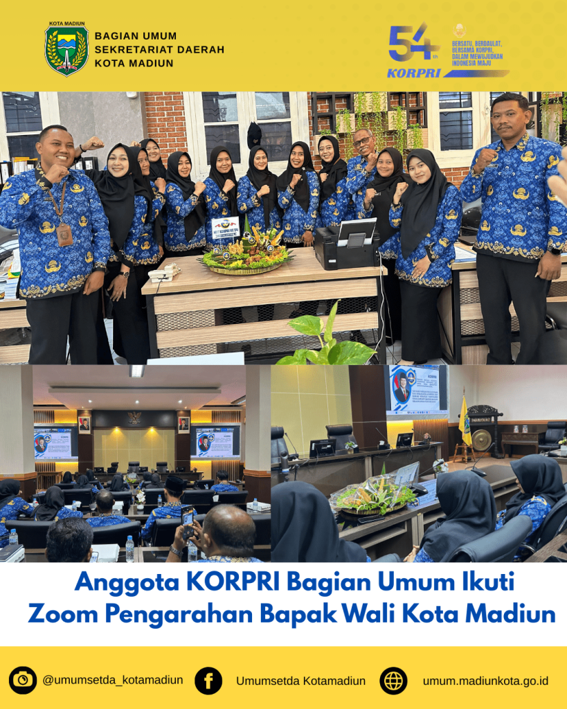 Dalam rangkaian Peringatan Hari Ulang Tahun KORPRI ke-54 Tahun 2025, Dewan Pengurus KORPRI Kota Madiun menggelar Zoom Pengarahan dari Bapak Wali Kota Madiun pada Rabu, 3 Desember 2025. Seluruh Perangkat Daerah, termasuk anggota KORPRI Bagian Umum Sekretariat Daerah Kota Madiun juga mengikuti kegiatan ini. Bertempat di Ruang 13, Balai Kota Madiun, anggota KORPRI mengikuti zoom dengan khidmat.